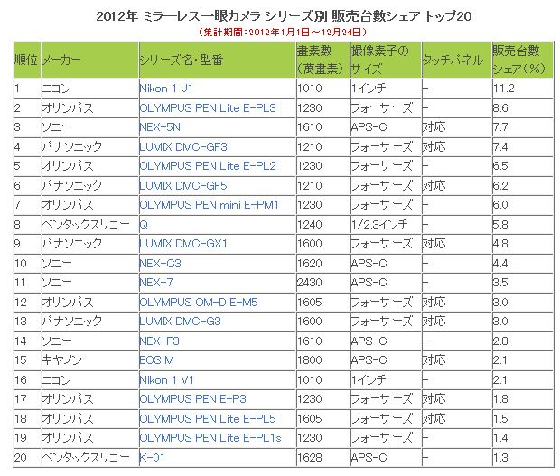 BCN Ranking 日前公布了 2012 年日本地區無反及 DSLR 相機銷售排名,統計時間為 2012 年 1 月 1 日到 12 月 24 日。以百份比去計算 Nikon 1 J1 以 11.2% 超越其他對手稱王,第 2 位及第 3 位分別是 Olympus Pen Lite E-PL3 及 Sony NEX-5N,分別為 8.6% 及 7.7%。Nikon 1 J1 在 2011 年 10 月底推出,銷售已有 1 年時間,至上年 9 月才有後繼型號 J2,但沒有進佔 20 大位置,反而推出只有約 2 個月的 Canon EOS-M 也進入了第 15 位,有 2.1% 銷量。其餘銷量百份比可以參考以下例表。
