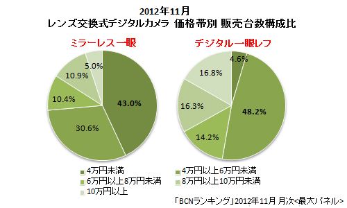 整體上 Canon 以 52.9% 取得最多市場份額,第 2 位的 Nikon 則為 34.8%。在無反相機市場上,選擇 4 萬日元或以下的比率為 43%,DSLR 則為 48.2%。雖然日本市場未能反映全球的相機銷量百分比,但也可以作為一個參考。