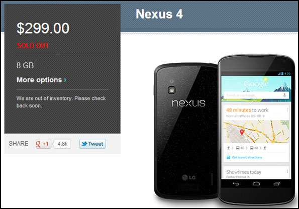 Google 在去年 10 月開始在 Google Play 上發售 Nexus 4,但很快便已售罄,比起「抽 iPhone 」還要困難。有用家發現原來它推出至今只賣過不到 40 萬部,難怪長期缺貨。