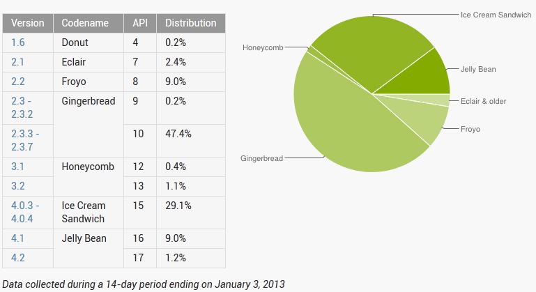 根據 Android 的最新統計數字見到,Android 4.1 及 4.2 版本 (它們均代號為 Jelly Bean) 的佔有率分別有 9% 及 1.2%,而 Jelly Bean 在去年 6 月底 Google I/O 上發佈,今次只花半年時間已有不少廠商支援,如 Samsung、Asus 等旗艦級產品,比起過往更快速。從以上圖表看到 Android 4.0.x (代號 ICS) 也有 29.1% 佔有率,即 Android 4.0 或以上已佔有近 4 成,不過 Android 2.3.x (代號 Gingerbread) 仍有 47.6%,幾乎接近一半。