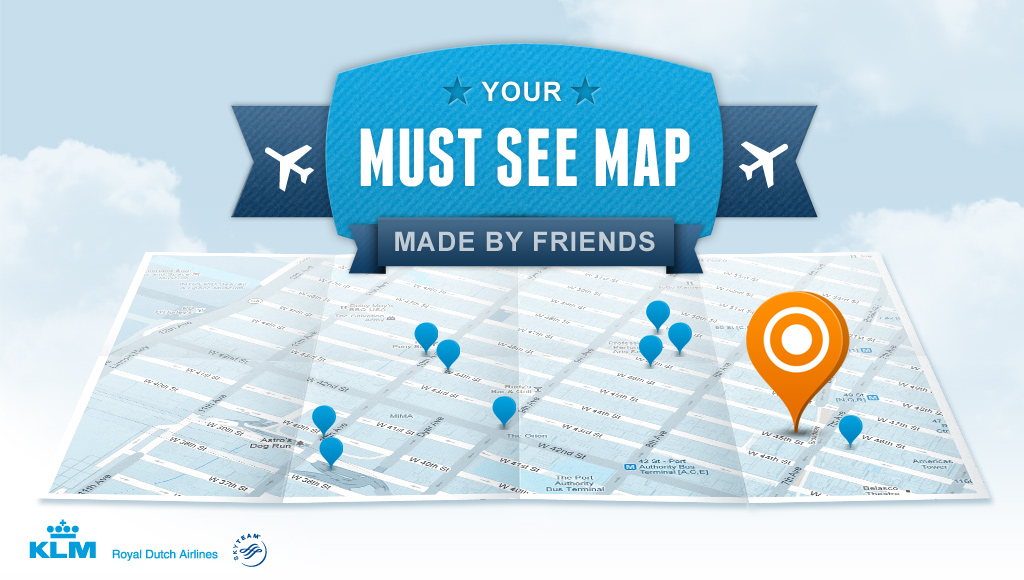推出這免費個人化地圖服務為荷蘭皇家航空 (KLM),你只要到它的「KLM Must See Map」網站,然後選「Create my own free map」,先挑選你要遊覽的目的地,並依指示輸入地圖名稱和電郵地址,再自行加入想要遊覽的名勝或品嚐的美食,亦可透過 Facebook、Twitter 或電郵,邀請親友提供食買玩貼士加入到地圖。