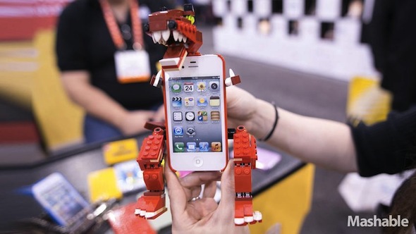 由 SmallWorks 設計的 BrickCase 5手機保護殼,在機背和機頂位置都可加上 Lego 積木。只要發揮創意就可製作別出心裁的獨家 iPhone 5 手機殼。在他們 CES 的攤位就展出了多款以 Lego 砌成,包括戰機、直升機,甚至暴龍的 iPhone 5 手機殼。
