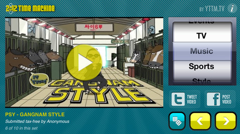 2013 開始了,大家掛住 2012 嗎?"2012 Time Machine" 可讓你重溫一下過去的 1 年,可回顧電影、音樂、電視、體育、遊戲、科技、活動、政治、風格,文摘和「爆紅短片」,你可選擇讓短片隨機播放,好適合用作消磨時間。 改變過去暫時是不可能的,這台時光機都只有「唯讀」模式,讓你看看過去 1 年的大、小、有趣事而已。它是收費的 App (HK$8.00)。 下載: