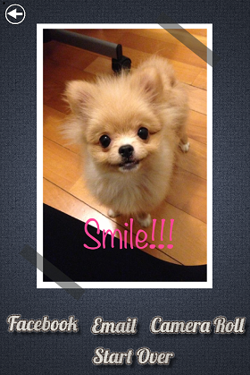 然後大家把自己加入的字拉到心水位置,按右上角的箭咀即可,大家就可選擇把照片上傳至 Facebook、透過 Email 傳出,或儲存在手機的相機卷內。