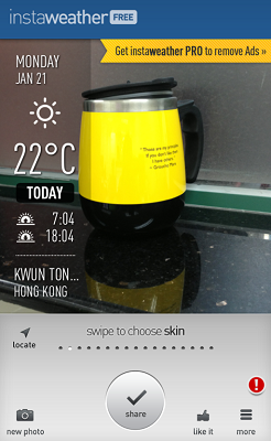有時在網上分享照片的時候,好想同時分享天氣和位置,尤其是旅行時,令人更能投入照片的環境。InstaWeather 這個 iOS 和 Android App 可幫照片加上你所在的位置、該位置的溫度、時間、日期等資料,簡簡單單就可令人更投入照片,更有藝術感地描述資料。