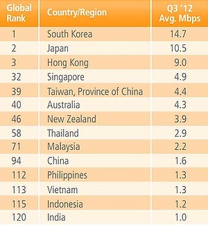 根據 Akamai 最新的報告指出,去年第 3 季全球提供 10Mbps 以上的寬頻速度比起去年上升了 8.8%,所有寬頻計算則增長了 4.8%。目前全球上網速度最高的地區是南韓,平均為 14.7Mbps,其次是日本,速度為 10.5Mbps,香港則有 9Mbps 排行第 3。另外在同一份報告上見到,亦有比較真正的連線速度及上網速度,如以連線速度比較,香港則排行第 1,達 54.1Mbps,韓國及日本分別排行第 2 及第 3,速度為 48.8Mbps 及 42.2Mbps,可見連線速度與實際速度有一定差別。資料亦透露巴西及中國地區的網絡用量最高,也是全球受到網絡攻擊次數最多的地區。