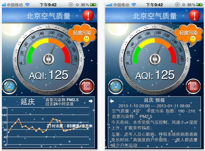 北京市環保監測中心高級工程師李雲婷表示,「北京空氣質量發布」App 能顯示首都 35 個監測站的實時數據,包括空氣質量指數 AQI 以及 PM2.5 等 6 項污染物濃度訊息。用戶除可自定顯示個別地區的空氣質素資訊外,亦可透過手機的 GPS 定位功能,查詢離自己最近的空氣質量監測站數據。