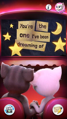 啟動 App 後會見到手拖手在看電影的貓貓湯姆和安吉拉,他們在看的屏幕正在播放他們的 MV 動畫,畫功可愛,帶點浪漫的色彩,喜歡湯姆的傻氣和安吉拉的性感。有 2 首歌可選擇,2 首歌都好 sweet,只要按左下角的圖案就可切換至另一首歌,而按右下角的信封,就有 7 張明信片出現,圖畫和意思都十分窩心感動。