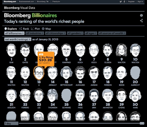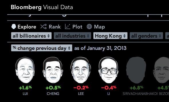財經網站 Bloomberg 早前製作了 1 個 Bloomberg Billionaires 的網頁,讓網民每日緊貼富豪身家排位榜的走勢。網站簡約易明,以各富豪的頭像作顯示,排名更可按不同的行業、國籍、性別、年齡、財富來源等排序。網站有專人每日根據富豪們的資產值升跌更新,所以你可以知道李嘉誠的身家比昨天下跌了0.4% (按網站 1 月 31 日的資料顯示)。