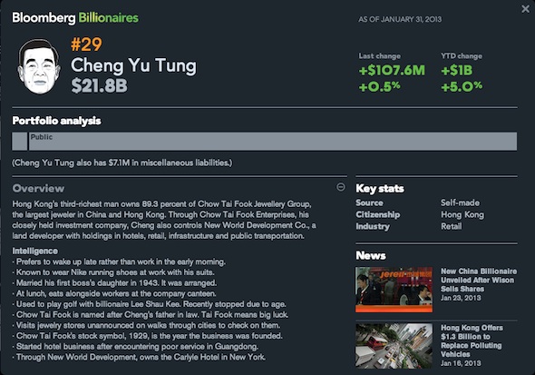 財經網站 Bloomberg 早前製作了 1 個 Bloomberg Billionaires 的網頁,讓網民每日緊貼富豪身家排位榜的走勢。網站簡約易明,以各富豪的頭像作顯示,排名更可按不同的行業、國籍、性別、年齡、財富來源等排序。網站有專人每日根據富豪們的資產值升跌更新,所以你可以知道李嘉誠的身家比昨天下跌了0.4% (按網站 1 月 31 日的資料顯示)。