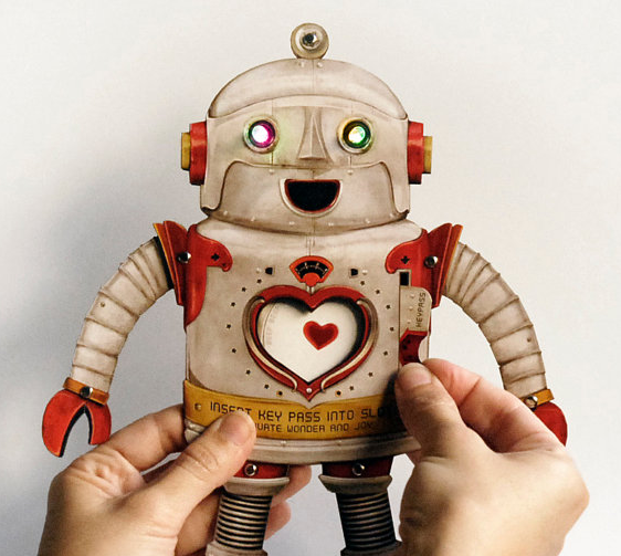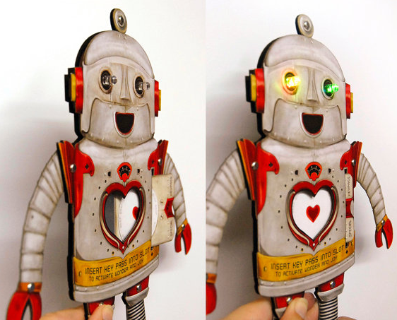 如你另一半是個電子迷的話,Robobbie 可能對他/她來說是張不錯的情人節卡,這是由 Etsy 的紙藝術家 crankbunny 創作,是 1 張機械人形的卡,顏色復古、舊舊的,感覺有不少經歷,但它並沒有壞,隨卡有一張匙卡,收到卡的人把它插入機械人的身體,就可啟動它的心,它的眼睛就會一閃一閃的亮起鮮艷的顏色燈光。由收到的人啟動它的心,懷舊感又切合歷久不衰的浪漫。