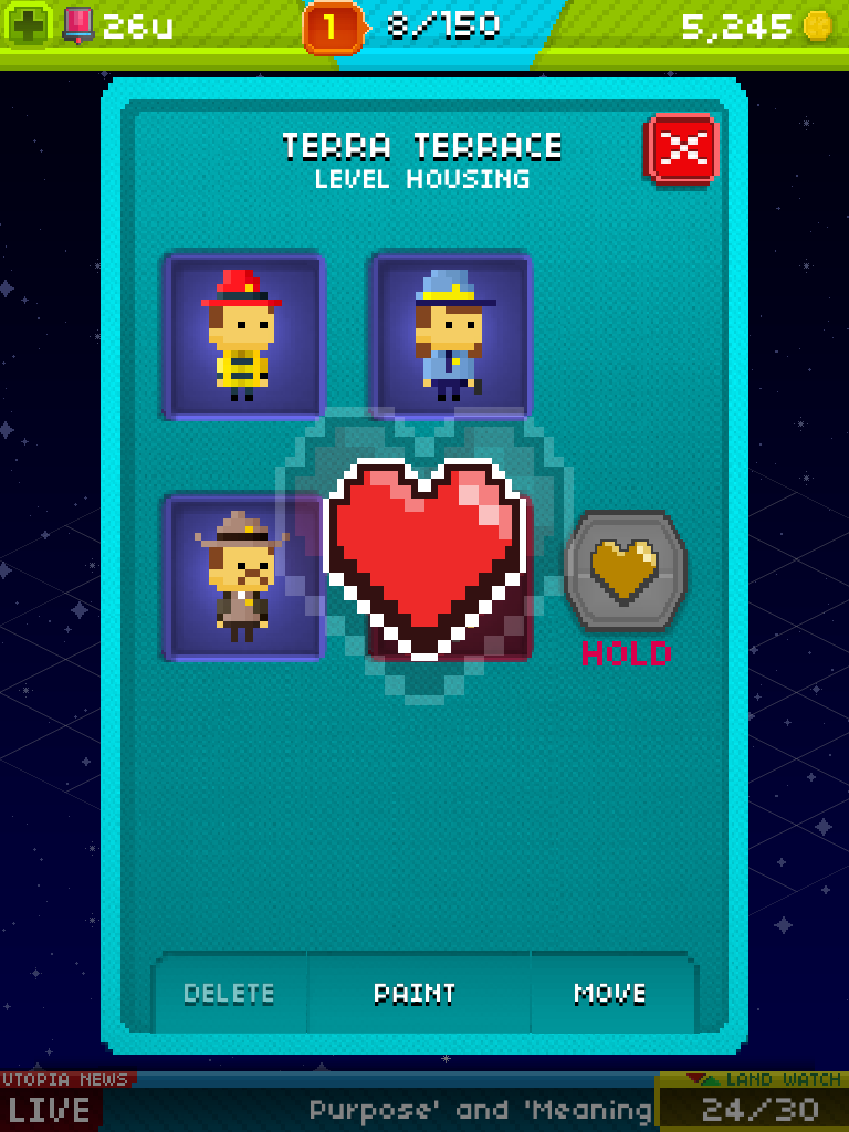 其實要創作出想要的人才不容易的,要考慮 2 個不同職業的特性加起來會變成什麼,大家都可用「u」換取製某行業員工的配搭方式,不過自己慢慢研究其實都幾開心。如在某個地方上面見到心形圖案出現,就按一下該地方,你會見到有 1 個心心,下面標有 hold,你就按實心心,直至心心與背面暗暗的心心一樣大小,這樣就可收集 1 個心心。