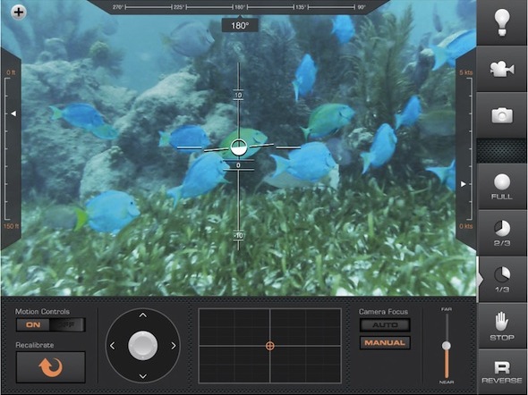 這部 Submarine Camcorder 有一條 100 吋長的影像傳輸線連接發射器,在 iPad 安裝專用 App 後,可以 iPad 操作發射器,遙控潛艇的移動;iPad 上的虛擬主控台,能夠控制鏡頭、顯示水底的即時影像、下潛的深度、方向、水溫、電池等資訊。
