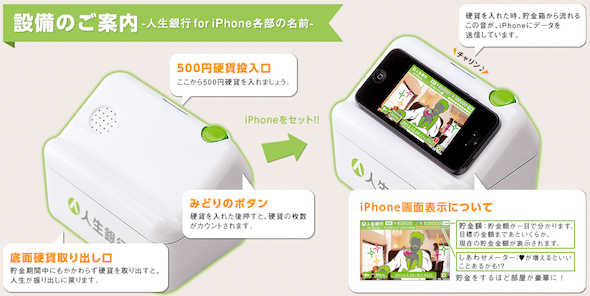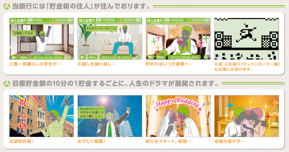 「人生銀行 for iPhone」用戶先在 iPhone App 上設定在某日期前的儲蓄金額,然後每次存入 500 日元,按下確認鍵後,錢罌就會發聲並與 iPhone 互動。當你的儲蓄還是很少時,App 內的主人翁生活會過得悲慘清苦一點,隨著儲蓄增加,生活亦得到改善;在完成目標的十份一或其他關卡時,「人生銀行 for iPhone」App 內的主角會有不同故事推進,例如就業、結婚、生孩子等,作為一點鼓勵。