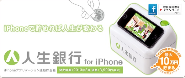 用戶可以不時查閱儲蓄的進度,亦可以透過社交網絡與朋友分享成果,互相勉勵打氣。當完成儲蓄目標後,不但會有爆機畫面,還可以取出錢罌內的金錢完成用戶的心願。「人生銀行 for iPhone」將會於3月開售,售價3,990日元(約$334港元)。