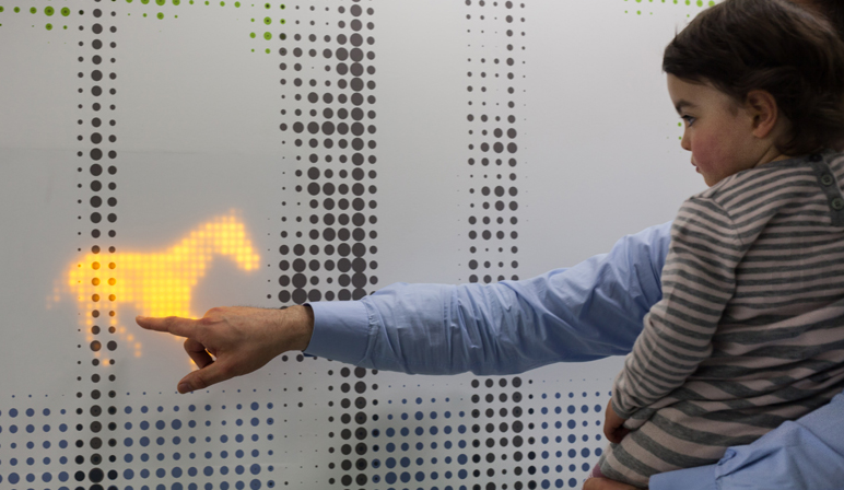 這道牆以 70 LED 板所製,牆的背後總共有 72,000 盞 LED 燈,會製造出如動物走過森林的效果。不同的板會隱藏在牆後面的不同高度,所以影像可以出現在不同高度的小朋友的眼前,用光「畫」出的動物像在牆上行走的動畫,小朋友應該會覺得十分有趣。