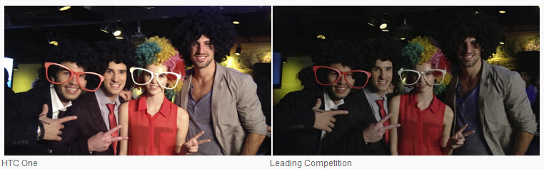 再配合 HTC One 的 f/2.0 大光圈鏡頭及 ImageChip 訊號處理器,從而令相片的吸光能力大幅提升,HTC 聲稱可達 300%,但就與 f/2.8 光圈鏡頭相機比起,吸光能力已相差達一倍,實際上 UltraPixel 技術只是是感光晶體更大的好處,但仍有較好的吸光能力也是事實。雖然只有 400 萬像素設計,但對於一般網絡相片來說實際上已經足夠,沖晒 4R 相片也不成問題,況且用手機拍攝的相片十居其九也只會放到網絡或與朋友作分享,實際上像素高低並不會有太大影響。不過一般消費者也會是像素先決,認為像素愈高愈好,現時新一代手機均達到 1,300 萬像素設計,難免會被比下去。要讓消費者知道 400 萬像素如何勝過 1,300 萬像素?相信要考起 HTC 的宣傳人員了。