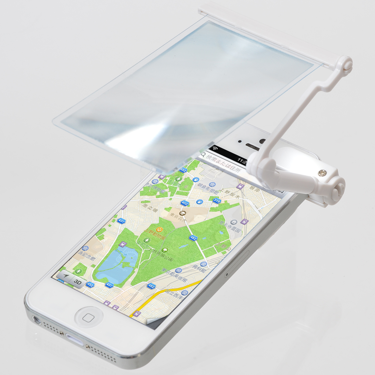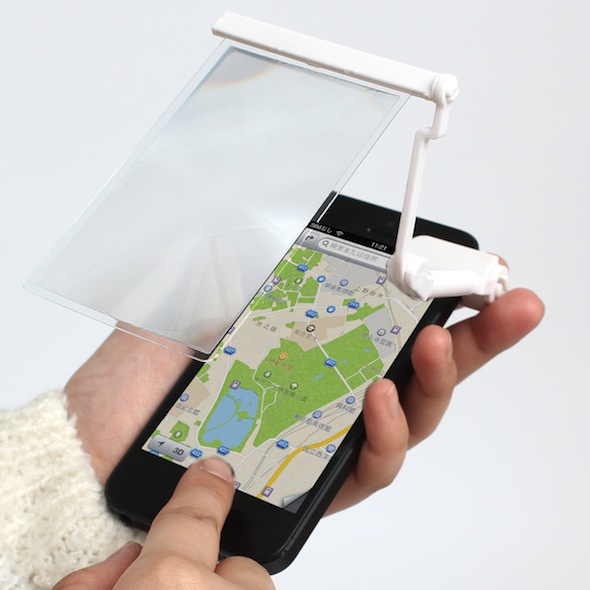 將這放大鏡夾在 iPhone 5 的聽筒旁,一拉出就可使用。根據產品介紹,放大效果達 2 倍,在不需使用時,8 至 10mm 厚的放大鏡片可摺疊收起並放在 iPhone 5 的機背。這個設計既簡單又實際,用戶可以單手操控之餘,屏幕顯示亦變大。放大鏡除了適用於 iPhone 5,同時亦支援Sony Xperia Z,售價為 1,580 日元 (約 $131 港元)。