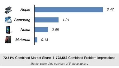 手機出現問題,有不少人會從網上詢問其他網友尋求解決方法。一個著名的問題解決社區網站就從最近的 72 萬個問題中作出分類統計,從 4 個牌子中得出結果是 Apple 的可靠性最高,遠勝於 Samsung、Nokia 及 Motorola 三個對手。
