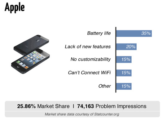 Apple 最多人認為的是續航力不足,但連缺乏新功能也佔了 20%,前者相信與 iPhone 5 的續航力差了有關,至今 iPhone 其實仍然比起不少 Android 手機的續航力力高。
