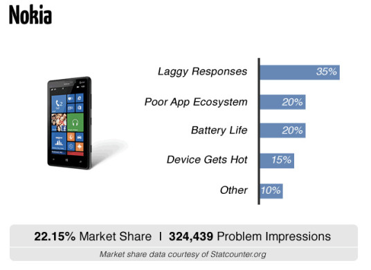 Nokia 的 Lumia 手機市佔率雖然愈來愈低,想不到連投票的人也不少。不少用家認為反應遲鈍已是問題,相信與舊有的 Windows Phone 7.x 有關,其硬件配備真的十分不滯,要到 Windows Phone 8 才算有所改善。至於應用太少也是大問題之一,這就是 Windows Phone 一直以來未能普及的原因。