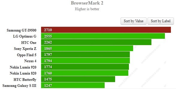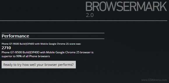 Browsermark 2.0 會測試網頁載入、HTML5、JavaScript、CSS3/3D、WebGL、Canvas 等多項網頁內的元素,從而得出一個整體分數作結果。此測試可以在不同的平台上運行,只要有瀏覽器便可。根據 Browsermark 2.0 的資料庫上顯示,Samsung GT-i9500 分數達 2,710,比起制推出的 HTC One 更高,也較上一代的 Galaxy S3 的 1,247 分高出一倍有多。除了 Galaxy S4 會用上更強勁的處理器外,測試中見到還配上新的 Google Chrome 25,勝過 99% 以上的手機速度。雖然跑分並未是大家選擇手機的指標,但手機的應用愈來愈多,效能愈好當然會更加方便,節省存取時間。