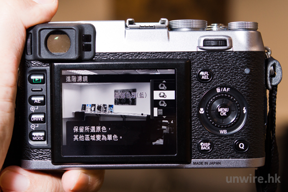 X100S 及 X20 加入大量的濾鏡功能,如以上的測試便是只將藍色部分還原,其餘變成黑白,實際上此功能早在 NEX 系統上出現。而其他濾鏡則包括 Toy Photo、Miniature、Pop Color、Soft Focus、Dynamic Tone、High Key、Low Key、Part Color 等,增加相機的玩味。