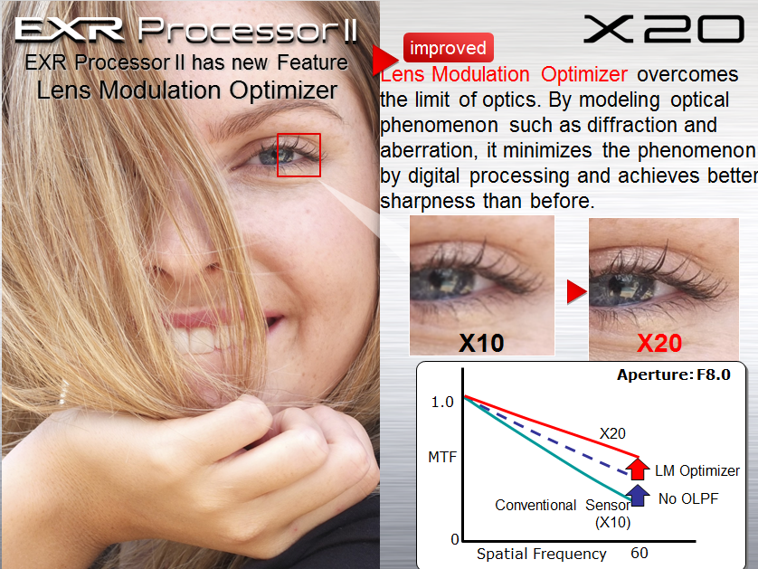 EXR Processor II 另一新增功能是 Lens Modulation Optimizer 設計,它將以往鏡頭收細光圈後的衍射問題改善,增加相片的銳利度,亦令細節上更豐富 (Fujifilm 表示 X100S 在 f/16 時分別最為明顯),同時推出的 X20 也具備此設計 (在 f/8 時會見到分別)。在記者會上就有數張相片作比較,的確見到整體感覺相片更清楚,再沒有輕微的模糊感覺。