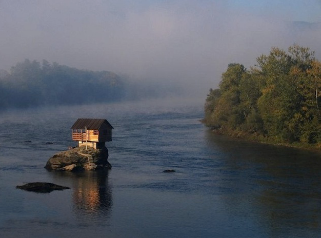 下圖的小屋已經有 45 年歷史,看來不太穩固的小屋卻頑強地平衡於河中的小石上。可能大家都會問:「為什麼在河中央的石塊上建屋呢?」這是因為在 1968 年有一班年輕的游泳者需要地方來休息,於是躺在河中的石上休息,之後他們開始想要更舒適的地方讓他們躺一下,於是就慢慢建成了圖中的小屋,就如沙灘中的浮台一樣,更漸漸成為塞爾維亞 Bajina Basta 的旅遊景點。