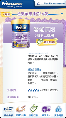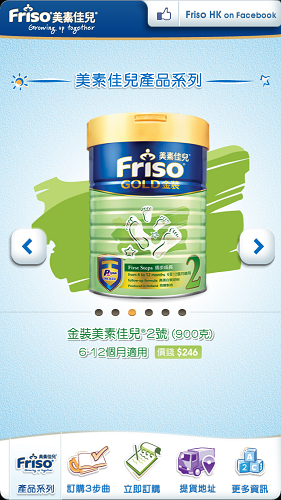 手機的 App 都不是只顧娛樂的,有時都可解決大家某些基本需要。如各位 BB 的父母覺得「撲」奶粉是件好難好麻煩的事,而 BB 平時都吃美素佳兒奶粉的話,父母就不用周圍撲了。美素佳兒推出了 iOS 和 Android App 「Friso 輕鬆訂」,讓家長隨時都可用手機訂奶粉。不過為免有任何閃失,家長都要預早一點訂購。