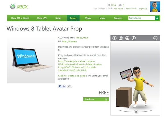 Xbox 玩家可在 Marketplace 領取,無論 Xbox Live 帳號是金還是銀都完全免費。領取後 Avatar 會顯示一組動畫,先按平板的觸控屏,然後聽 1 段 Xbox Music。Avatar 聽了好幾秒音樂後,Type Cover 會突然出現並與 Surface 平板連接,展示磁石的吸力。然後 Avatar 會使用 Surface 打字,最後當然少不免打一下廣告,以 Windows 8 的商標作結。