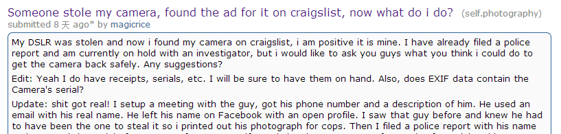 Jeff Hu 決定引賊人到距離警罯不遠的咖啡店交收,賊人同意了交收的時間及說出了電話號碼,Jeff Hu 放工後,就在家找尋所有可證明相機和裝置是屬於他的文件、賊人的照片、把自己填寫了的警察報告打印出來,萬事俱備,只欠相機編號,但相機的盒又在父母家中,幸運地,他發現一個叫 Stolen Camera Finder 的網站,可以照片找尋相機編號。於是他更新了警察報告,加了相機編號及其他辨識資料。