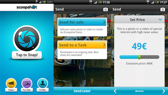 Scoopshot 是一個讓人人有機會當業餘攝影記者的 App,在 iTunes App Store 或 Google Play Store 免費下載 App 和登記後,就可以進行拍攝,將每天發生的大小事,以相片或錄像方式上傳到 Scoopshot,加上背景資料、地理資訊後再定價,如果有媒體機構要購買你的作品,就會按照價格付錢;如果該機構希望相片、錄像是獨家採用,他們更要付出 10 倍的代價。