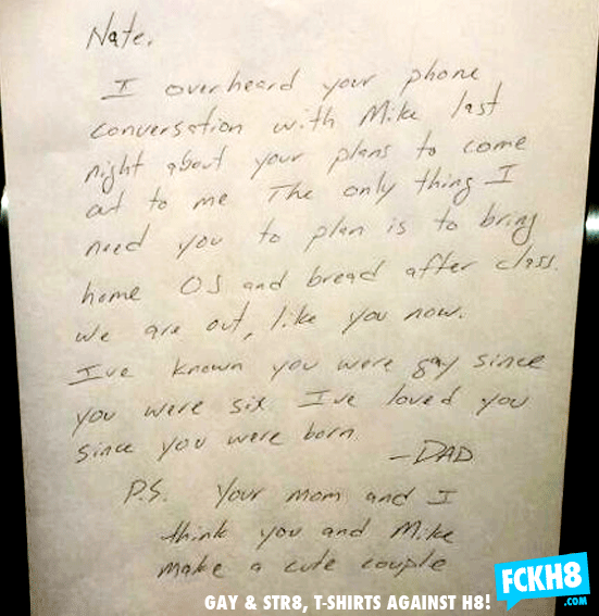 在世界各地同性戀的問題都鬧得翻天覆地,要成為一個同性戀者需要面對社會、道德、家庭等壓力,有人不能接受,但支持的聲音都不少。有一位父親在知道兒子其實是同性戀的,並無激動的大吵大鬧,都無設法要他變回異性戀,而是寫了一封信表示尊重並接受他的性取向,而且暗示支持他的意思,好多人都覺得這封短短的信寫得非常感人,經 FCKH8 (一個激進的同性戀組織) 登出後即被瘋傳。 來源: FCKH8 Facebook Page