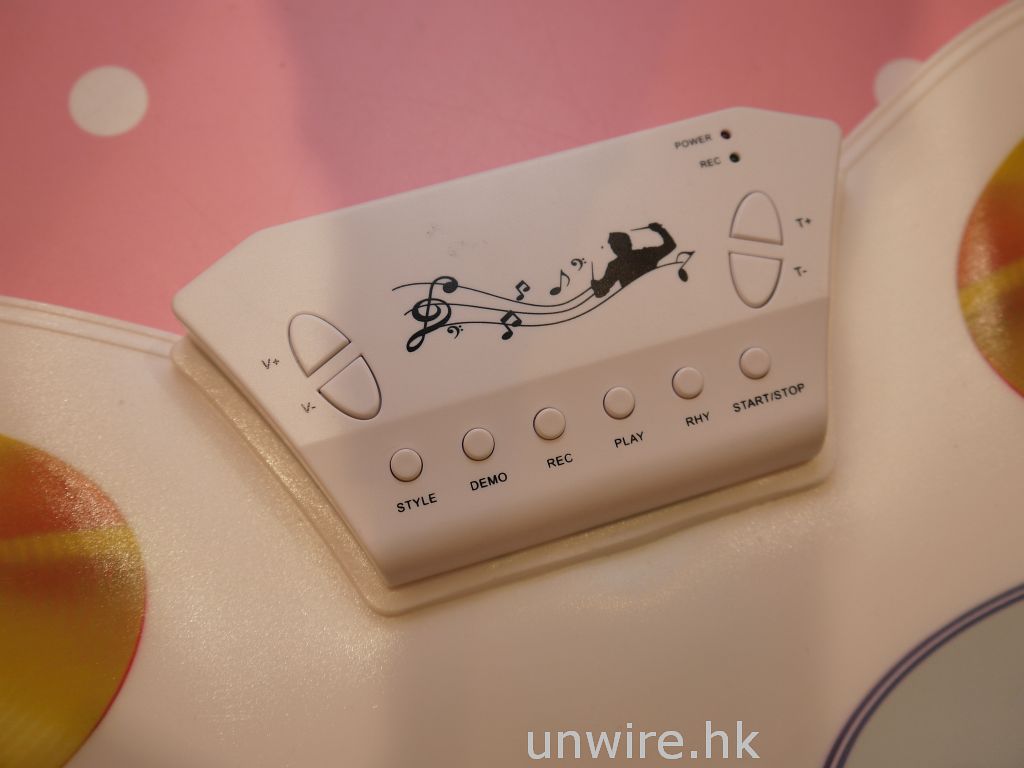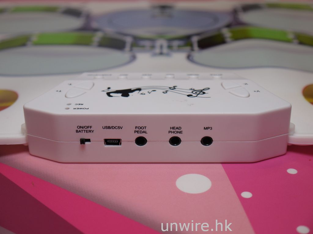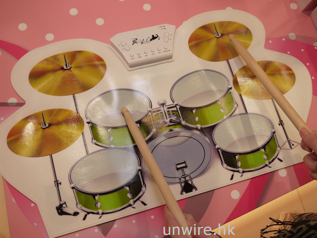 除有套可摺起的鼓外,更設有腳踏、鼓棍。它彩色的設計把一套鼓畫出來,令人更清晰知道自己在打真鼓的哪個位置。裝置內有收錄歌曲,大家可跟拍子練習演奏。同時都設有錄音、播放、RHY 等功能,可配合到簡單的練習,不要預期它會像真鼓一樣,它只能作練習之用,或讓大家技癢時解決一下。另外用家可連接耳機使用,不怕被鄰居投訴。
