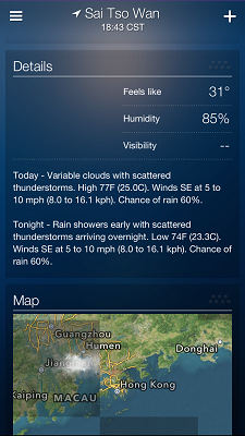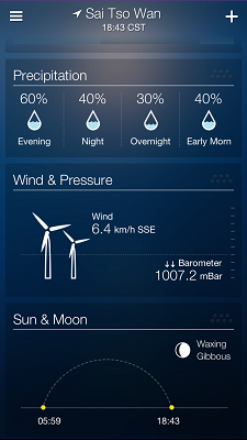 「Yahoo! 氣象」可自動找出你所在位置的資料和圖片,圖片拍得十分優美,向上一掃就可以得到好多資料,再繼續掃就有體感溫度 (即身體實質會感受到的溫度)、濕度、能見度及天氣的報告和資料,再掃下去就是地圖、落水量、風向及風速,最後就是日出/日落時間,資料齊備,照顧到想進行不同活動的朋友呢!