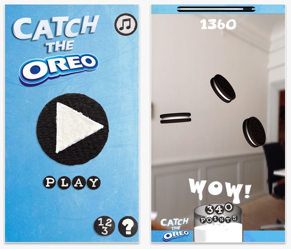 Oreo 手機 App 有 Android 和 iOS 版本,飛船會將餅乾從天而降,玩家需要將餅乾用裝滿牛奶的杯接住,玩法簡單。但遊戲開發商將 AR 虛擬實境技術加入,令遊戲更逼真過癮。