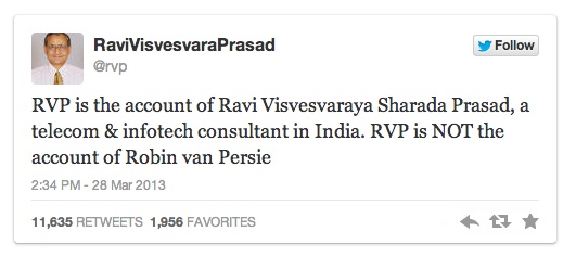 在曼聯贏波後,射入 3 球,被球迷簡稱為 RVP 的雲佩斯(Robin Van Persie)馬上成為擁躉和敵對球迷的討論話題,不少人一心以為雲佩斯的 Twitter 代號是 @RVP,原來這竟然屬於印度電訊顧問 Ravi Visvesvaraya Sharada Prasad,而雲佩斯的 Twitter 代號應為 @Persie_Official。在短短 24 小時內,Ravi 就收到過萬條恭賀訊息,更有不少人嘗試 Hack 入 @RVP 的帳號,試圖盗用這被誤以為是雲佩斯的 Twitter。Ravi 雖然覺得困擾但不失幽默,更在 Twitter 上開玩笑,贏得球迷的歡迎。