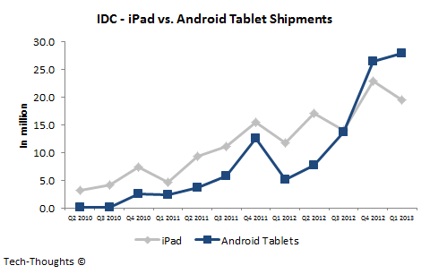 iPad 帶起了平板熱潮,Android 平板推出多年至今才百花齊放,令用家可以有更多選擇。年前 iPad 仍然佔有絕對優勢,但到了上年底其增長開始放緩,現在更被 Android 陣營超越,似乎 Tim Cook 要快點想想辦法了。