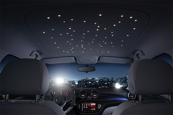 Opel 其中 1 款力推的內裝選項就是車頂的星空 LED 燈飾,選配後會在車頂安裝 64 枚 LED 燈模擬星光效果,不過這設計其實是「老翻」Rolls Royce Phantom,但 RR 的 Starlight Headliner 選項則用上 1,600 枚光纖小燈打造壯觀的效果,然而 12,000 美元的價錢差不多足以購買 1 部基本版的 Opel Adam。