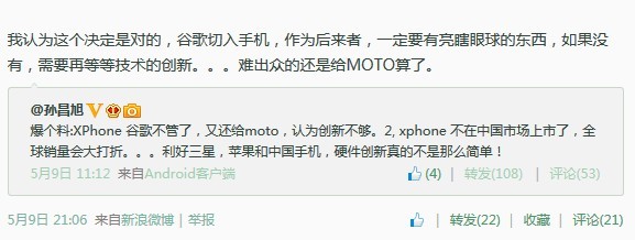 雖然 Motorola 早已被 Google 收歸旗下,但多年來均是「各走各路」,Google 一直以來均沒有太多的參與,至今仍沒有任何一部「親生仔」推出。原定的 X Phone 計劃就是 Google 真正參與的手機研發,可惜 Google 認為其設計未符合要求,早前更表示其設計與 18 個月前的產品無異,未能在市場上作出競爭。中國微電子產業知名分析師孫昌旭日前就在微博上爆料,指出 Google 已放棄了 X Phone 研發項目,創新不足,就算推出也不會在中國市場銷售,並認為此消息將利好 Apple、Samsung 或其他中國手機。不知道孫氏是得知內部消息還是作出估計呢?如果 X Phone 真的消失,相信 Motorola 要再次翻生看來有點難度了。