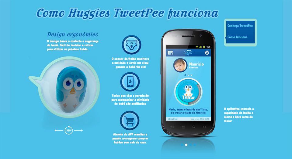 感應器除了可以感應濕度轉變外,還可連接專用手機 App,監察每天尿片使用數量,監察「庫存」並提醒入貨,更可以透過手機買尿片。可惜的是這原來是 Huggies 和廣告公司的概念產品,在感應器和手機 App 還未實際推出前。最傳統的人體嗅覺感應器還是最有效的方案。