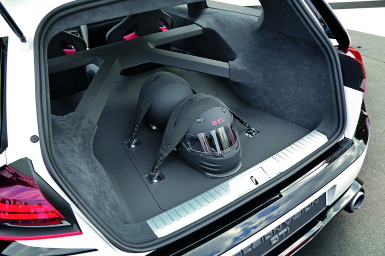 車廂的硬朗設計風格與車身一致,中控台設計簡潔,以碳纖搭配麖皮作為佈置,由於 Design Vision GTI 不設後座,所以後座的空間就用作安裝強化剛性的支架和放置頭盔。