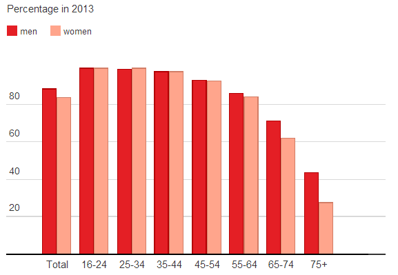 至於男女上網比例上,整體以男性佔多,達到 88%,女性則只有 83%,但在 44 歲或以下的網民則以女性略為多一點,不同的年齡層均多 0.1% 至 0.3%。而隨著年齡的增長,44 歲或以後年紀愈大的女性會上網的比例愈少,到了 75 歲時則只餘下 27.3%,相比起男性的 43.7% 低得多,相信與沒有人教導使用有關。其實在歐洲國家之中,英國 只有 14% 人未曾接觸上網的比例算低,根據早前歐盟的資料顯示,未曾觸觸過上網的人平均數字達到 22%。