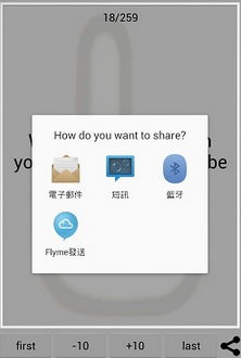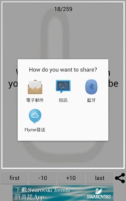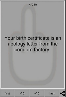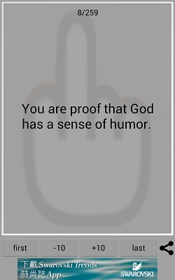 這個 Android app 叫 “Insults & Flames App”,app 如其名就是為你介紹一些侮辱人的英文句子,一開 app 就見到一句句英文,如果見到適用或有趣的句子可以 email、訊息等分享出去,句子有太多,大家如果記得某一句大概在 100 多的位置時,可用跳 10 句或減 10 句的方式加快找尋的速度。