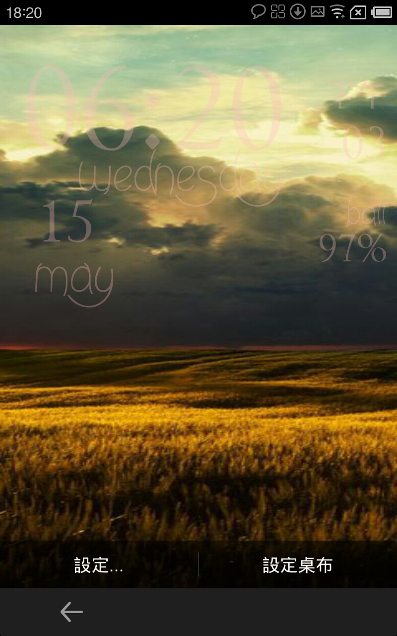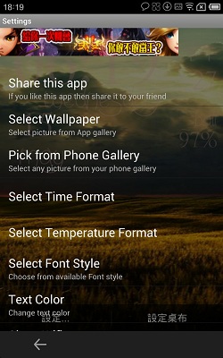 進入 app 後,大家按左下角的設定設計自己想要的桌布,大家可以選用 app 內的桌布,選擇超多,而畫功或照片都十分優雅,另外大家都可以用手機中的照片做桌布。之後可選擇時鐘、溫度的格式,然後就到選擇字體、文字顏色,最後大家可以選擇是否把 Wifi、電量、框框、天氣顯示於桌面上。配搭太多了,挑剔的朋友可能會為這個桌布花費不少時間呢!