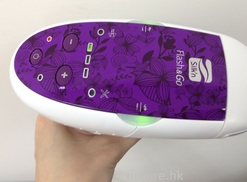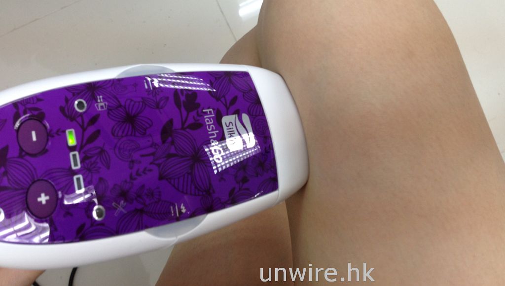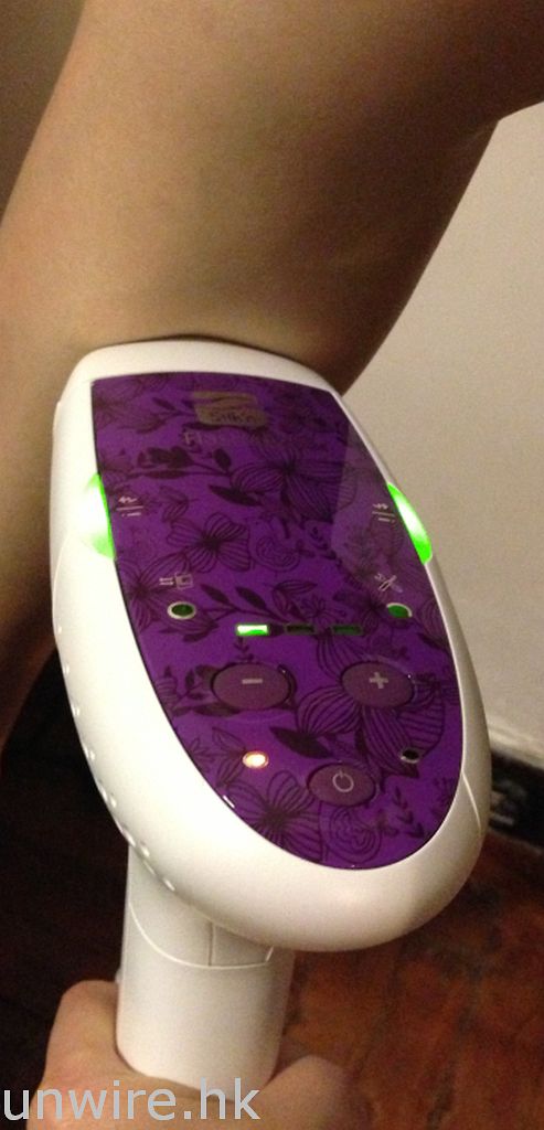 小妹開始使用 Silk’n Flash & Go 啦!先剃去脫毛部位的毛髮 (注意請用剃的方式去除該部位的毛髮,否則會影響效果),並確保皮膚乾爽清潔。之後把隨機附帶的電線連接至手槍形儀器的底部及連接至電源,綠色的待機顯示燈會亮起,按下開機按鈕開機顯示燈會亮起,之後會聽到有點令人不安的風筒聲,但不用擔心,這是正常的。儀器有 5 個強度,第 1 次使用時先用最低的光波強度測試皮膚,機頂上有 3 盞長方形綠燈顯示強度,亮起一盞燈時強度最弱。