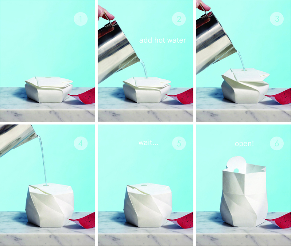 瑞典專門研發包裝的 Innventia 最近開發了 1 款新型的包裝技術,只要倒入熱水,經過特別處理的紙製包裝在遇熱後會自動延伸,最後擴張成為 1 個碗或紙杯。由於包裝以紙為原料可完全生物分解,不會對環境造成污染。希望有杯麵生產商能夠盡快採納這新技術,吃杯麵時就可少一份內疚感。