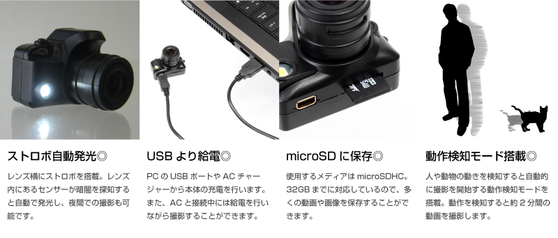 這款由日本廠商 Thanko 推出的超迷你相機,仿照 DSLR 設計採用連鏡頭的一體式造型,但體積只有 38 x 33 x 28mm 大小,17g 重量,機身具有迷你快門鍵及開關鍵設計,與一般扭蛋相機大小無異,當然 LCD 屏幕等欠奉。但此相機已內建了 500 萬像素感光元件,可拍攝 2560 x 1920 解像度相片,支援 JPG 格式相片每張大小約為 1MB,也可以記錄最長 2 分鐘的 1280 x 720@30fps AVI 影片。儲存容量視乎 microSD 大小而定,最大可以支援 32GB。相機亦已內置了電池設計,需要透過 USB 接頭充電,定價為 5,980 日元,不算昂貴,用來送禮或作小玩意十分適合,預定 6 月推出。