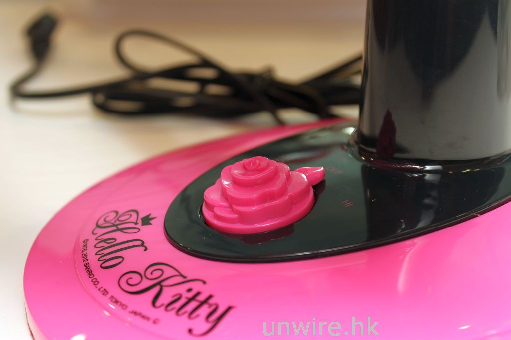 黑色桃紅色的 Hello Kitty 風扇艷麗搶眼,小妹雖不是 Hello Kitty 迷,但都覺得它顏色吸引。另外它的造型頗細緻,面罩上有黑面 Hello Kitty,而轉動式的調校鍵 (同時為開關) 設計成 1 朵玫瑰花,可配合桃紅、黑的主色,背後控制風扇固定還是活動的位置都是花花造型的。但它只有 2 個強度,而且「體型」不大,炎炎夏日在無開冷氣的情況下單用它可能會覺得它太「溫柔」不夠涼,大家用電腦又開了冷氣都覺得熱時,用它吹一下自己和電腦。